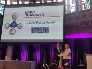 Sophie van Vreeswijk has been recognized with the VIRAN Poster Award at the 27th Netherlands’ Catalysis and Chemistry Conference (NCCC XXVII), held on March 2–4, 2026. Her poster, titled “Pt-based Zeolites as Bifunctional Catalysts for Polyethylene Depolymerization,” explores how zeolite-based catalysts can break down polyethylene into valuable chemical products. The research compares ZSM-5 and Y